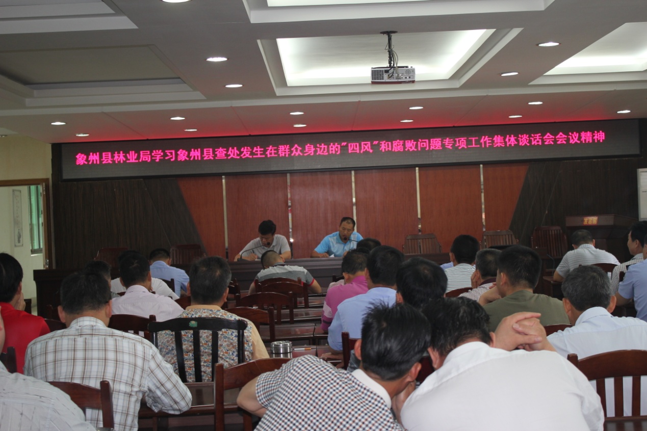 2016年5月18日上午,象州县林业局组织召开学习传达象州县查处发生在群众身边的"四风"和腐败问题专项工作集体谈话会议精神。会上,林业局局长覃友康同志对2016年开展"两学一做"学习教育进行动员部署,要求全体干部职工严格自律,遵守各项规章制度,确保学习教育出成效。