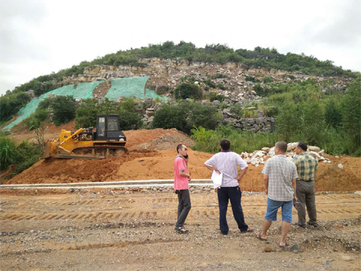 2017年9月全市开展林政资源管理工作专项督查督查组检查合山市润城太金石材有限公司采石场违法用地项目。