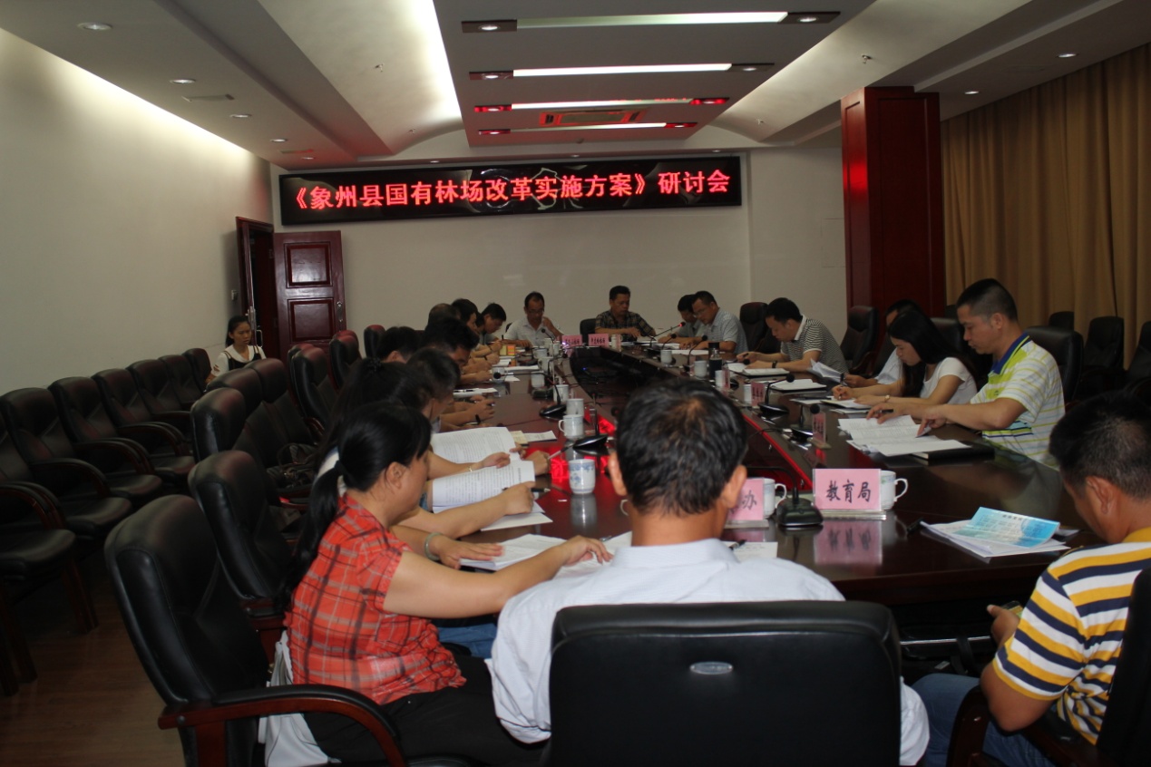 2017年8月15日上午,象州县召开国有林场改革实施方案研讨会。人民政府分管领导、政府办分管领导、县国有林场改革工作领导小组成员单位分管领导以及三大林场的负责人等参加会议。